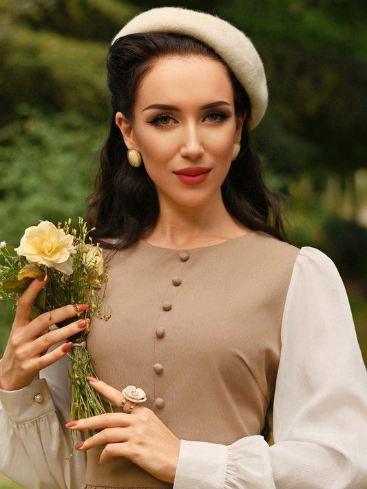 Vintamour Vintage Elegant Ladies' Round Neck Long Sleeve A-Line Dress With Organza Patchwork, Ruched Lantern Sleeves, Button Closure, For Casual