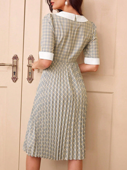 Vintamour Vintage Elegant Women's Midi Dress, Colorblock Collared Short Sleeve Plaid Flare Dress For Summer