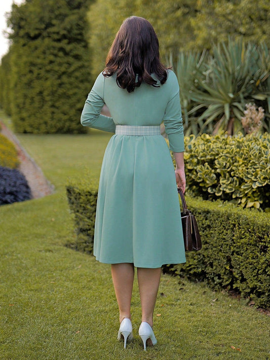Regular price £27.99 GBPRegular priceUnit price / per£28.99 GBPSale price £27.99 GBPVintamour Retro Elegant Women's Wool Houndstooth Color-Block Turndown Collar Long Sleeve Flare Midi Dress
