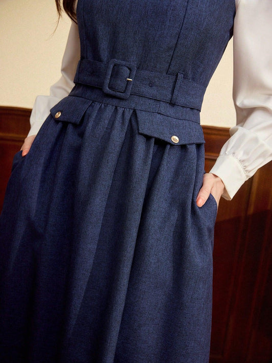 Vintamour Vintage Retro Elegant Women's Sleeveless Square Neck Dress With Pockets Waist Belt Ruched Flare Hem A-Line Dress New Years Dress Valentine Day Valentines Valentine's Day Valentine Day Dress