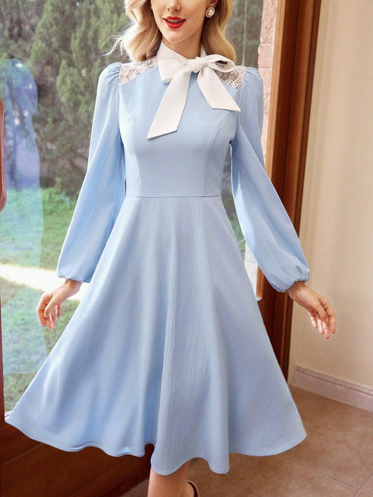 Vintamour Vintage Retro Elegant Women Dress With Pockets Bow Tie Lace Patchwork A-Line Hem Casual New Years Women Outfit Vacation Outfits Woman Dresses For Women Elegant Long Sleeve Dress
