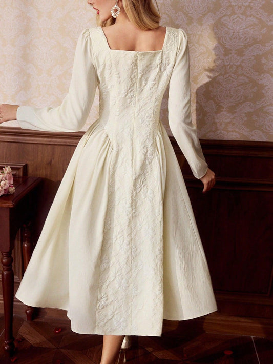 Vintamour Retro Elegant Women's Fitted Jacquard Woven Long Sleeve A-Line Dress, Beige Valentine Day Valentines Clothes Dresses For Women Elegant Business Casual Woman Wedding Guest Dress Women Church Clothes Women Modest Dresses For Women