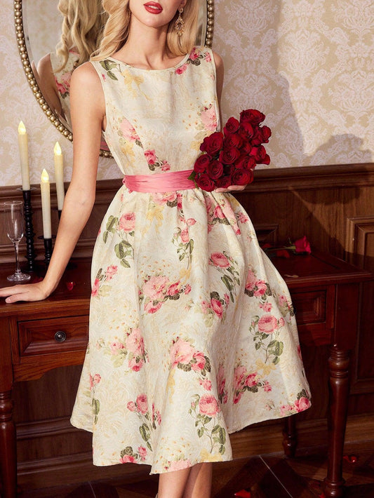 Vintamour Vintage Elegant Women Rose Flower Print Jacquard Fabric Sleeveless Bow Tie A-Line Dress Vacation Party Valentine Day