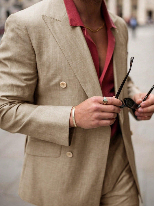 Luxury Gentleman's Double-Breasted Suit Set With Notched Collar, Vintage Fashion Business Commuter Wear