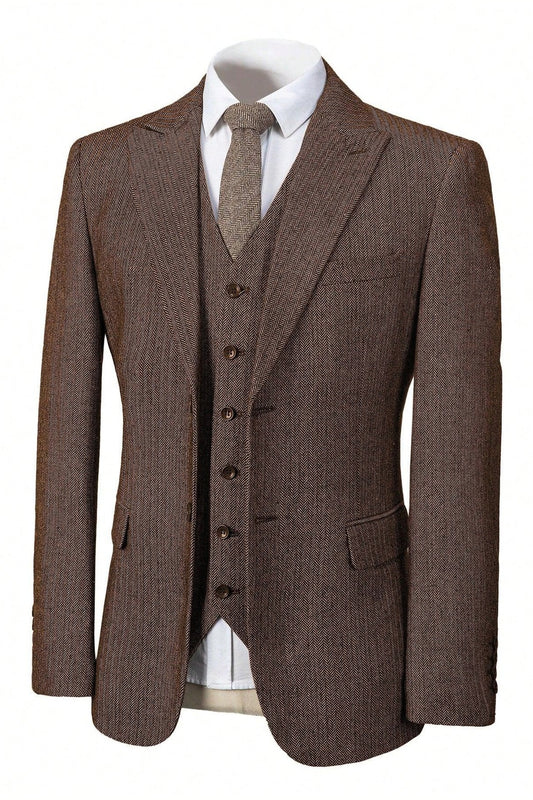 3 Pieces Men's Tweed Suit, Vintage Herringbone Wedding Prom Tuxedos Peak Lapel Dress, Long Sleeve, Casual Business Suit Set, Jacket Vest Pants