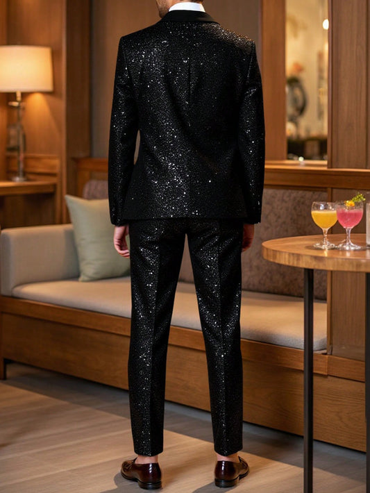 2pcs Men's Shiny Starry Black Suit Set, Jacket And Pants, Suitable For Business, Wedding, Party, Banquet, Formal Occasions