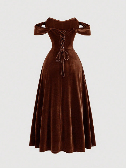 Solid Off Shoulder Lace Up Back Flare Hem Velvet Dress