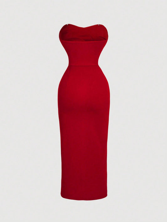 Women Ruffle Floral Print Red Strapless BodyconDress
