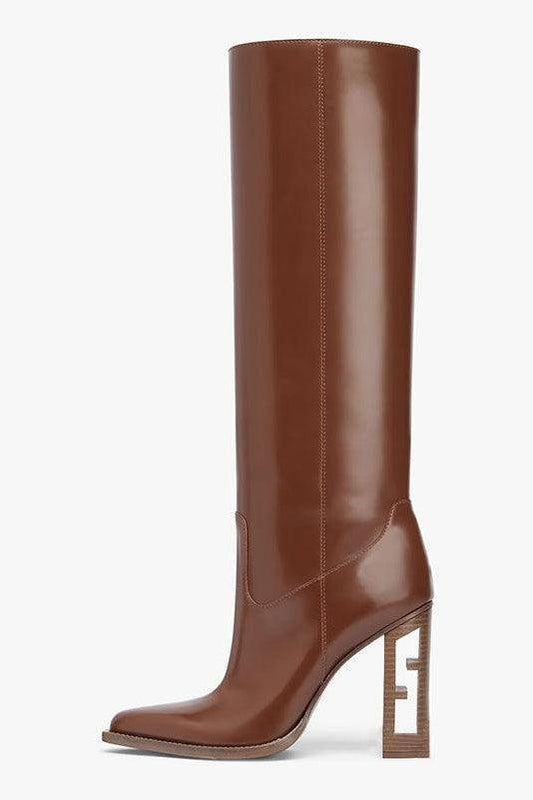 Square Toe Hollow-out Chunky Heel Cowhide Commuter Long Fashion Boots