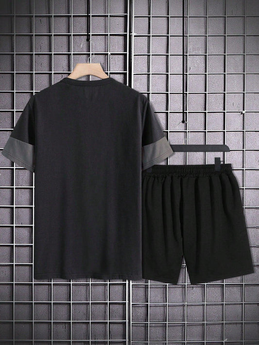 Manfinity Homme Men Summer Sports And Leisure Color-Block Letter Printed Round Neck Short Sleeve T-Shirt And Shorts Combo
