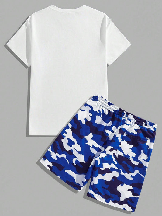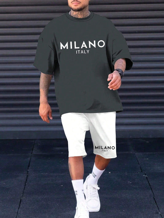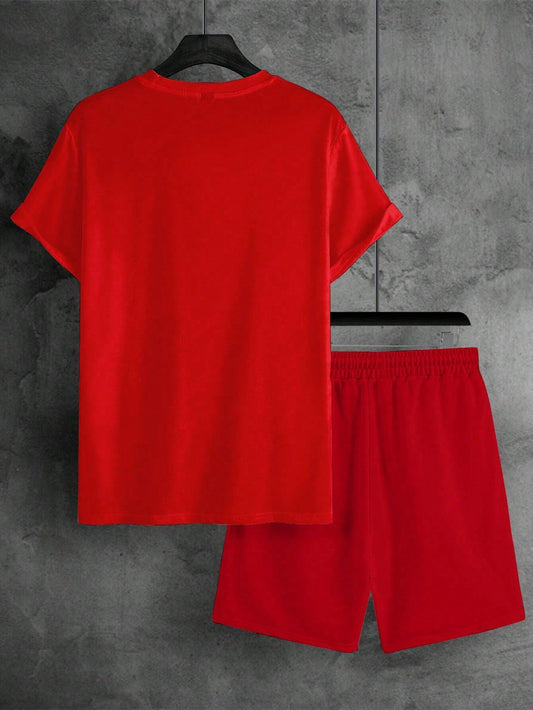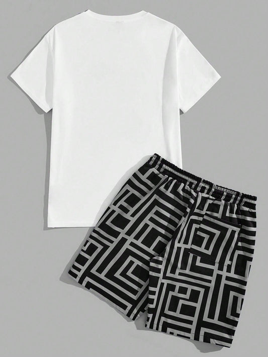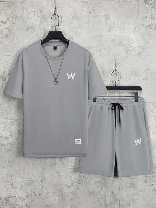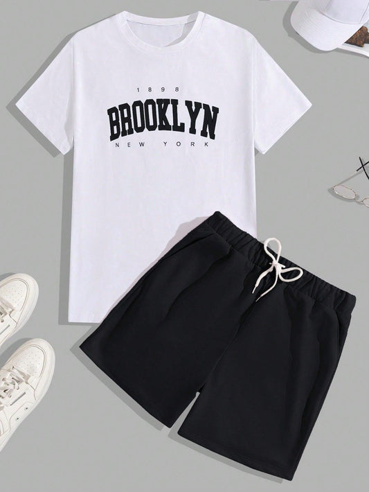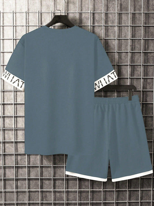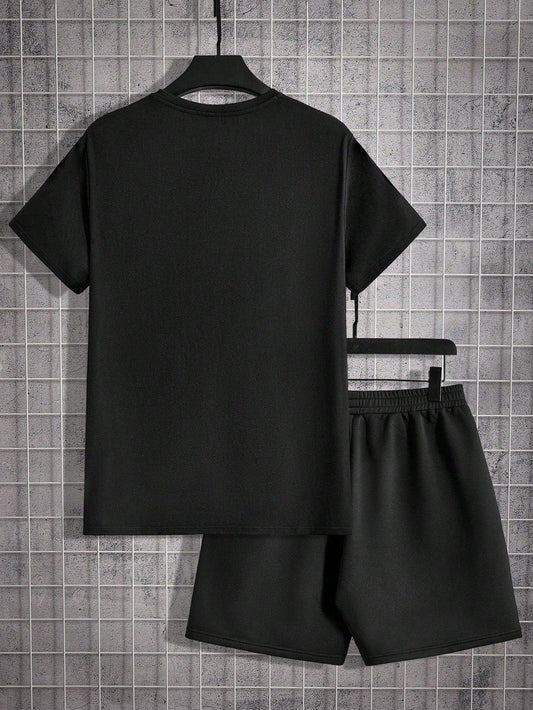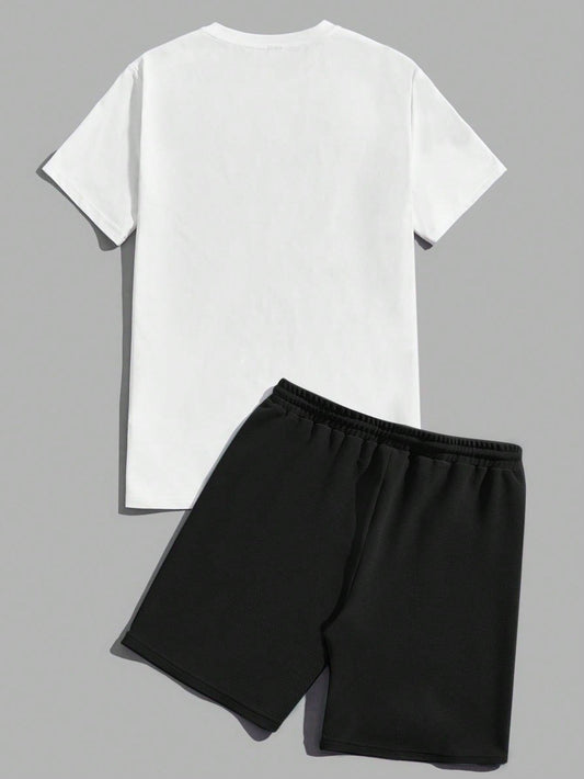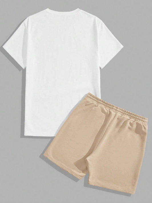 Manfinity Homme Men's Summer Casual Short Sleeve T-Shirt With Letter Print And Drawstring Waist Shorts Set
