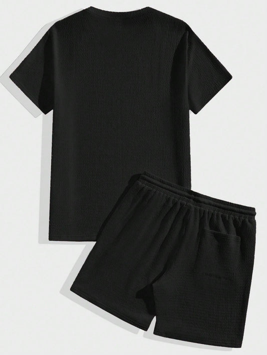 Manfinity Homme Men's Plain Textured Knit Casual Short Sleeve T-Shirt And Shorts Set