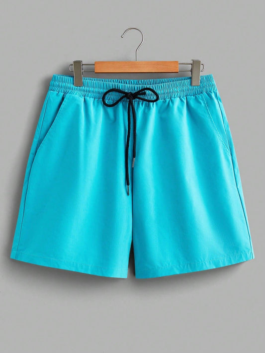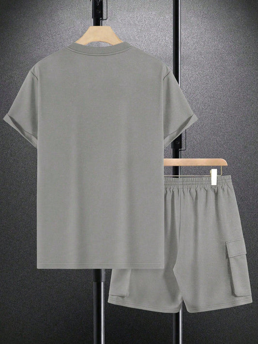 Manfinity Homme Men's Summer Solid Color Round Neck Short Sleeve Casual T-Shirt And Drawstring Waist Utility Shorts Set