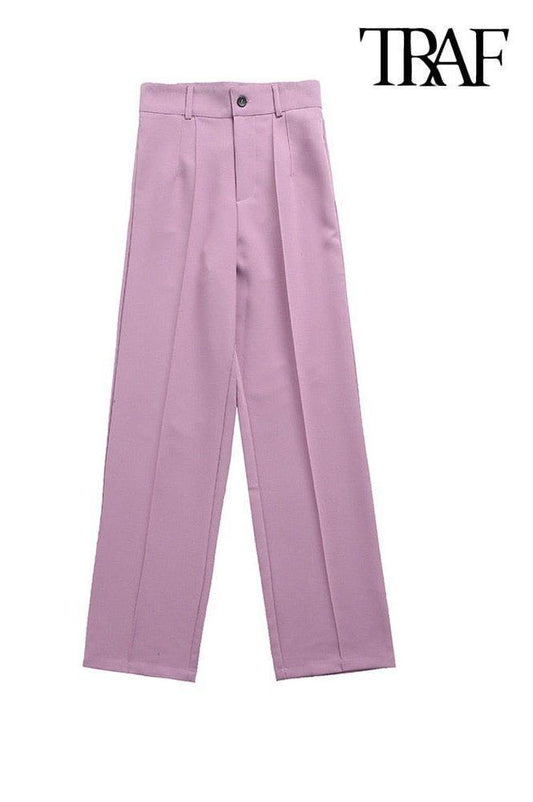 TRAF Women Chic Fashion Office Wear Straight Pants Vintage High Waist Zipper Fly Female Trousers Mujer