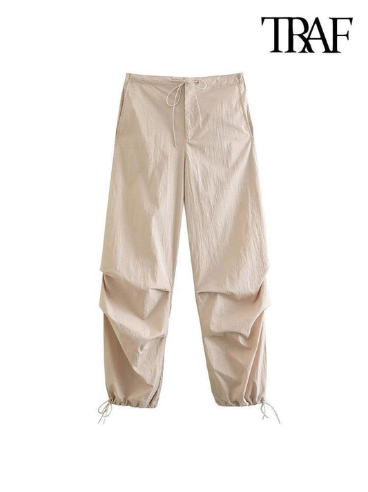 TRAF Women Fashion Side Pockets Pleats Knee Jogging Pants Vintage High Elastic Waist With Drawstring Female Trousers Mujer