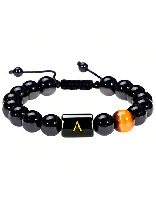 1pc Natural Black Agate 26 Letter Beaded Adjustable Braided Bracelet, Suitable For Various Occasions Like Festivals, Sports, Casual, Business Wear