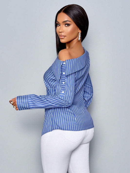 Vendor:SheinRegular price £7.19 GBPRegular priceUnit price / per£7.69 GBPSale price £7.19 GBPSOLERSUN Spring, Summer And Autumn Women's Striped Printed Button-Front Shirt, Asymmetrical Hem, Bat Sleeves, Wrap Shirt Sleeves, Winter Clothing, Elegant, Daily Commuting, Going Out, Valentine's Day, Vacation, Love Pattern Casual Long-Sleeved Top
