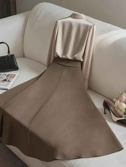 Franclia Elegant And Fashionable Shirt With Shiny Fabric Long Sleeves Beige Shirt And Khaki Skirt Two-Piece Set For Women For Autumn And Winter Fall Outfits Women Elegant Business Beige Fall Women Clothes Business Casual Woman Office Outfits For Women Lo
