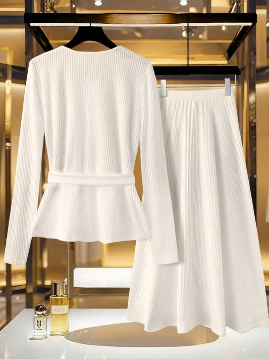 Regular price £32.39 GBPRegular priceUnit price / per£34.66 GBPSale price £32.39 GBPWomen's Solid Color Long Sleeve Metal Single-Breasted Top And Midi Skirt Elegant 2 Pieces Set, Autumn