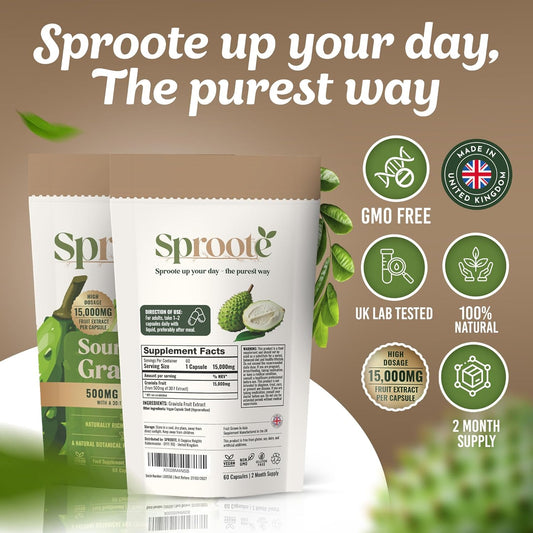 Sproote Soursop Capsules | 15,000mg High Strength Graviola Extract | Natural Antioxidant & Immune Support | Vegan Soursop Supplement | Soursop Leaves, Tea & Drops | 60 Capsules