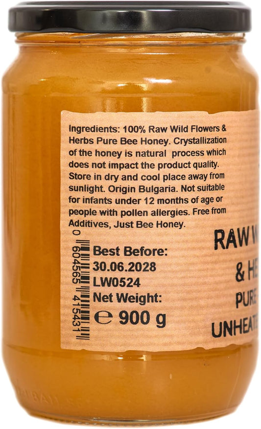 900 g Pure Raw Wildflowers Honey - Unfiltered, Unheated, Unpasteurized, Single source, Straight from RAW FARM own bee hives. (900, Wildflowers)