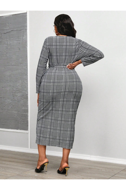 Maweii Plus Size Houndstooth Dress With Belt For Women, Elegant Knot Design To Show Your Figure, Long Style Maxi Women Outfit