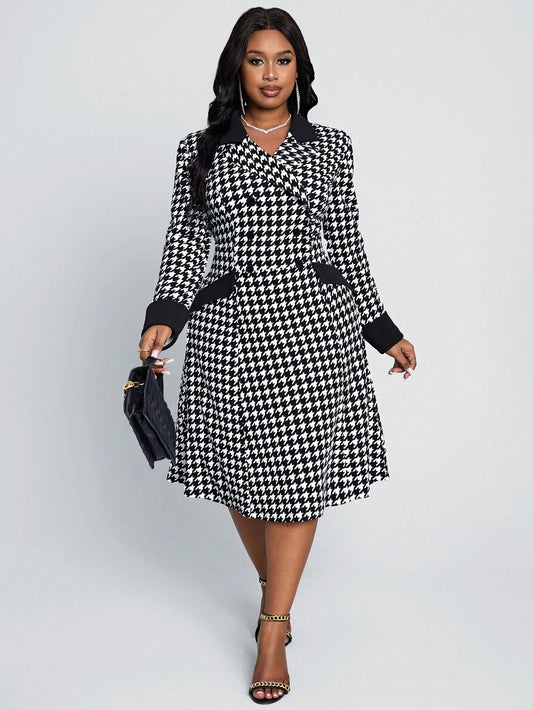 Plus Size Classic Black And Houndstooth Printed Turn-Down Collar Buttoned Waist-High A-Line Dress Four Seasons