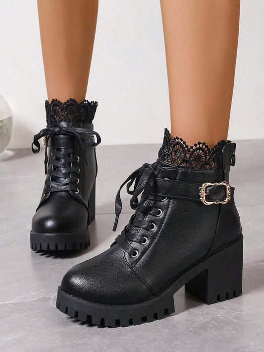 Plus Size Lace-Up High-Top Ankle Boots, Chunky Heel, Fashionable & Sexy, Black Chunky Heel Short Boots, High Heel Waterproof Platform Ankle Boots, Thick Sole Lace-Up Chunky Heel Shoes, Round Toe Mature Women Sexy & Comfortable All-Match Autumn/Winter Ank