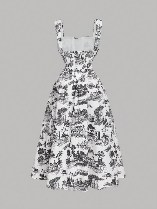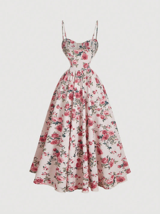 Floral Print Bustier Cami Blue And White Contrast Striped Waist Corset Structure Dress,Vacation Outfits Woman,Summer Dress,Country Outfits,Beach Vacation Wear,Spring Dress,Easter Dress Women,Summer Dresses For Women,Tea Party Dress